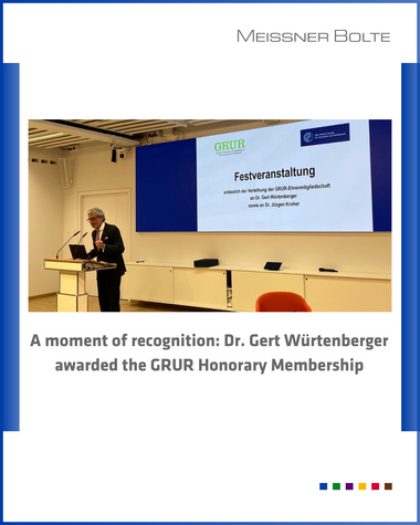Wir freuen uns sehr bekanntzugeben, dass unser Kollege Dr. Gert Würtenberger mit der Ehrenmitgliedschaft der GRUR ausgezeichnet wurde – einer der höchsten Anerkennungen im deutschen Gewerblichen Rechtsschutz.